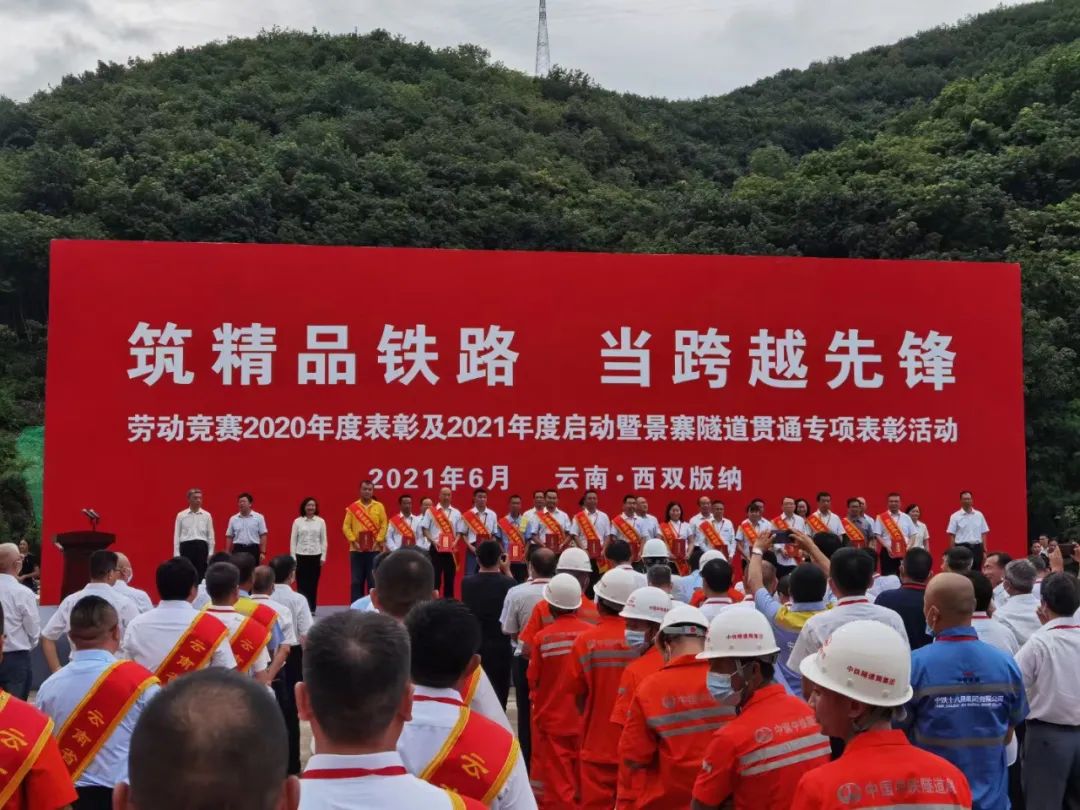 6月11日,云南省“筑精品铁路 当跨越先锋”劳动竞赛2020年度表彰及2021年度启动暨景寨隧道贯通专项表彰活动在中(国)老(挝)昆(明)万(象)铁路景寨隧道正洞进口建设现场举行。云南省人大常委会副主任、省总工会主席王树芬出席活动,并宣布云南省2021年度“筑精品铁路 当跨越先锋”劳动竞赛启动,云南省副省长邱江出席活动并讲话。