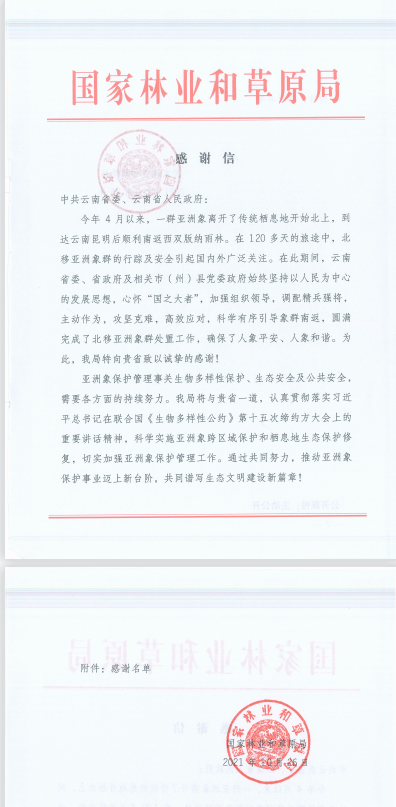 近日,国家林业和草原局向云南省委、云南省人民政府发来感谢信,对亚洲象群北移南返期间,云南省委、省政府及相关州市和单位主动作为、积极应对、科学处置表示感谢,公司玉楚项目部赫然在列。
