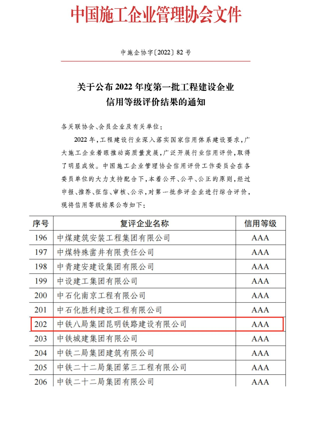 近日,从中国施工企业管理协会(简称“中施协”)传来好消息:2022年10月,中施企协2022年度第一批工程建设企业信用评价结果正式公布,经过“中施协”专家组成员审核考评,公司再度获评“AAA级信用企业”荣誉称号。