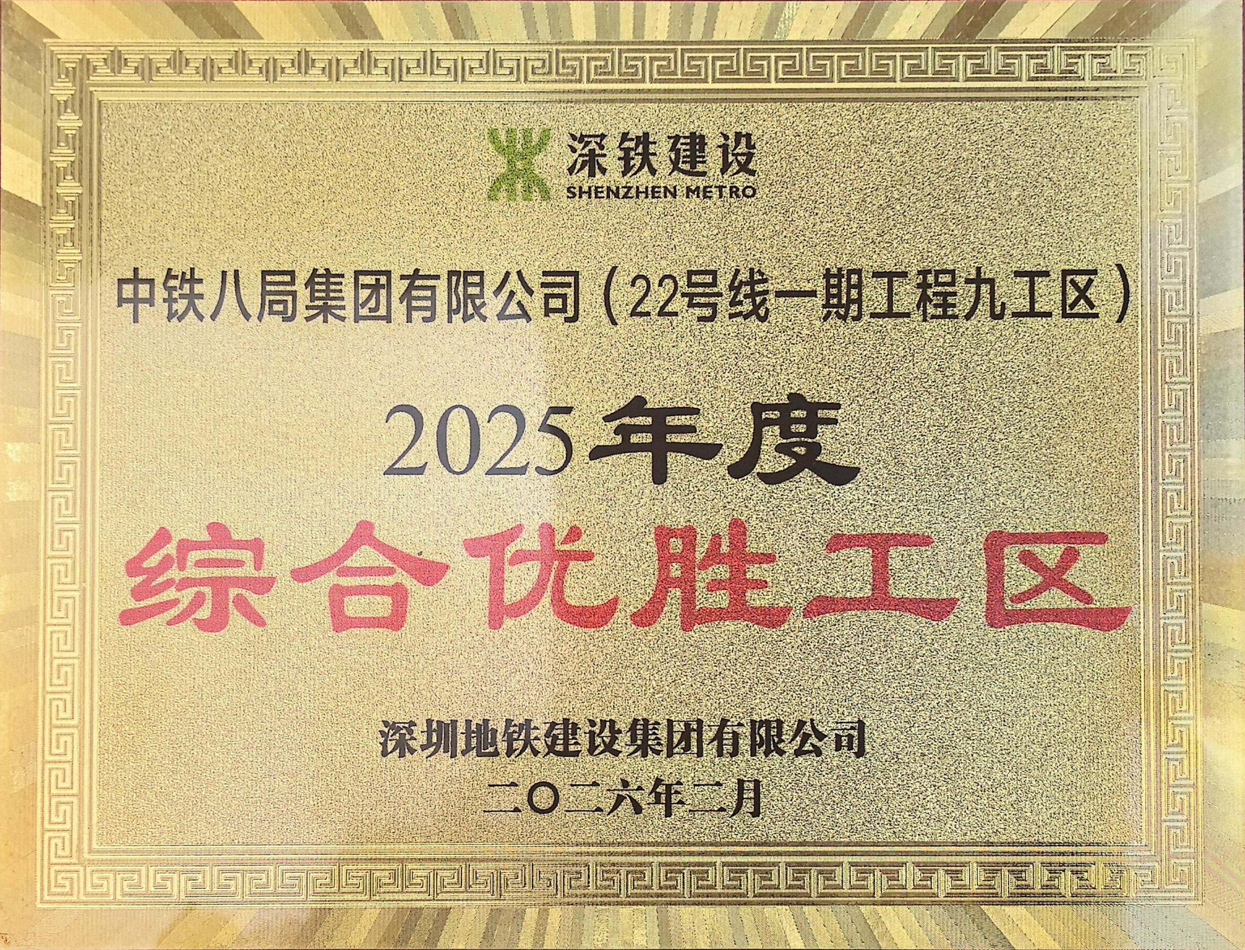 近日,中铁八局深圳地铁22号线土建九工区项目部喜讯频传,凭借扎实的基础管理和高质量的年度工作成效,分别在深圳地铁建设集团有限公司组织的2025年度各项考核中荣获“综合优胜工区”“安全质量优胜工区”称号,在2025年4季度考评中获得综合管理、安全质量管理考核“双第一”;在中铁南方22号线联合体项目经理部2025年四季度综合考评中获得第一名,并获评“2025年度综合典范项目第一名”“2025年度成本典范项目”等多项荣誉。