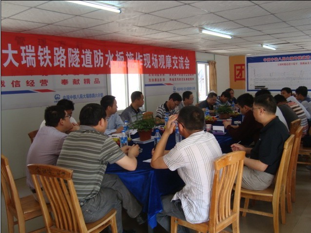 来自大瑞铁路一标、二标、三标段的中铁八局、中铁一局、中铁二十三局等各项经理、技术负责人、指挥部领导、监理负责人等40余人,参观了公司大瑞六分部施工的大坡岭隧道,现场观摩了隧道防水板施作工艺,然后在六分部会议室召开了大瑞铁路隧道防水板施作现场观摩交流会,昆明铁路局滇西铁路指挥部安质部长郭世炜在会议上要求大瑞铁路各项目隧道防水板施作,以集团公司大坡岭隧道为样板,集团公司大瑞经理部总工程师姜宾和公司大瑞六分部经理贾仕强同志分别在会上作了经验介绍交流。