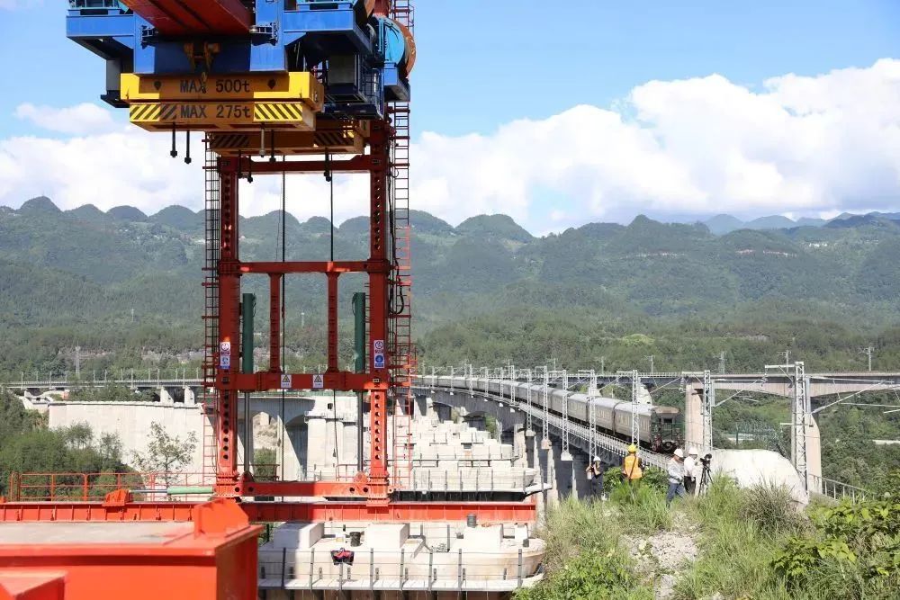 此次进行首架施工的玉泉村双线特大桥位于重庆市黔江区境内,全长920.915米。为确保首榀箱梁顺利架设,项目部精心部署、周密安排,充分调动各类资源,就邻近及上跨营业线架梁施工、箱梁内侧翼缘板长度调整及小曲线梁端顶板局部加长等重难点工况反复研究部署,组织召开多次现场生产会研究制定详细可行的架设方案、安全措施及应急预案,优化施工方案,规范作业程序,顺利完成了首榀箱梁的成功架设。