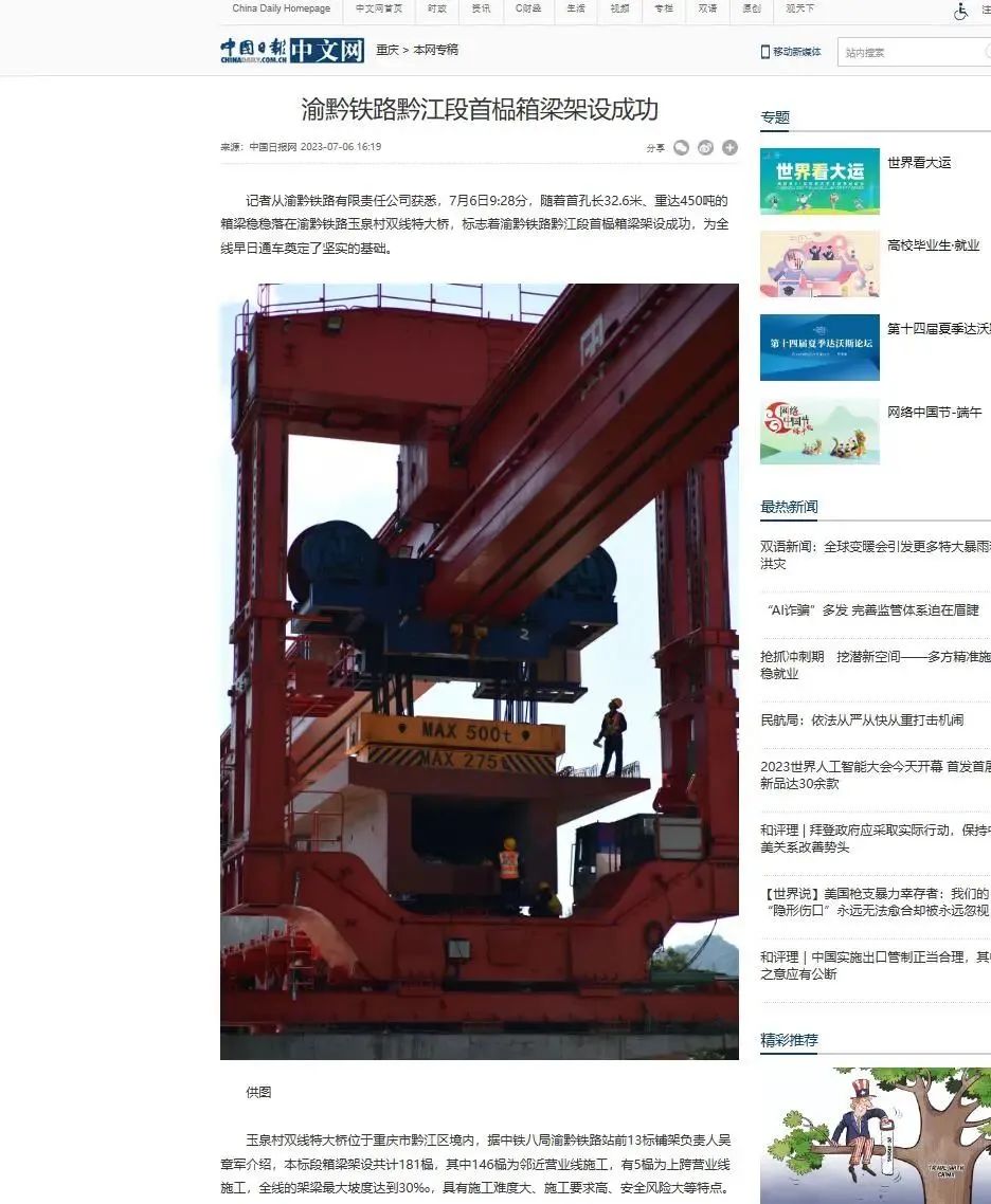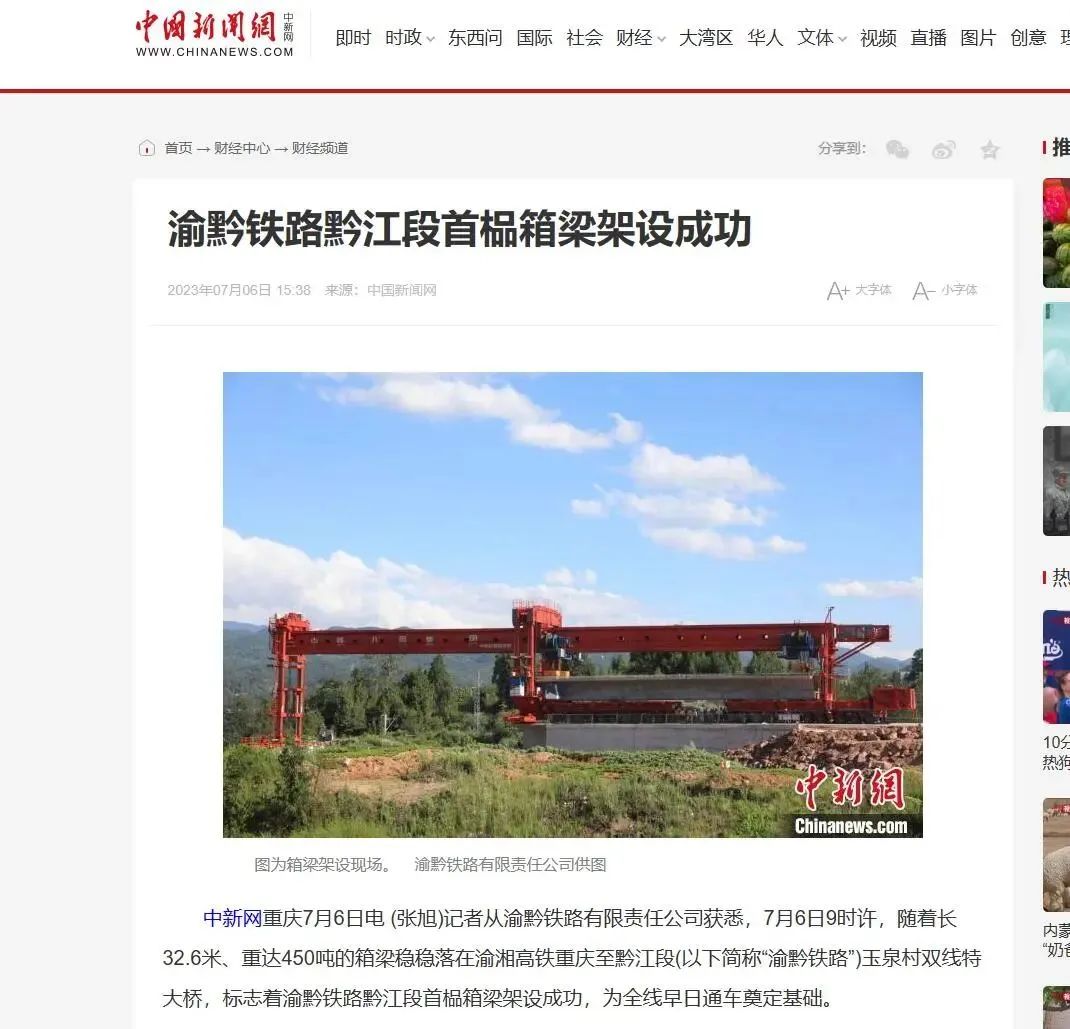 7月6日9时28分,随着首孔长32.6米、重达450吨的箱梁稳稳落在渝黔铁路玉泉村双线特大桥,由中铁八局参建的渝黔铁路黔江段首榀箱梁架设成功,为全线早日通车奠定了坚实的基础。