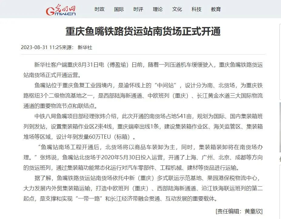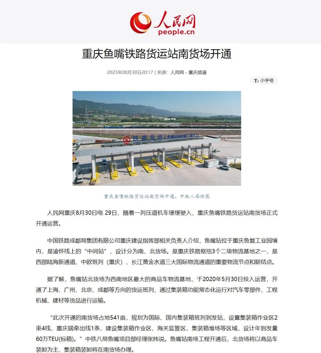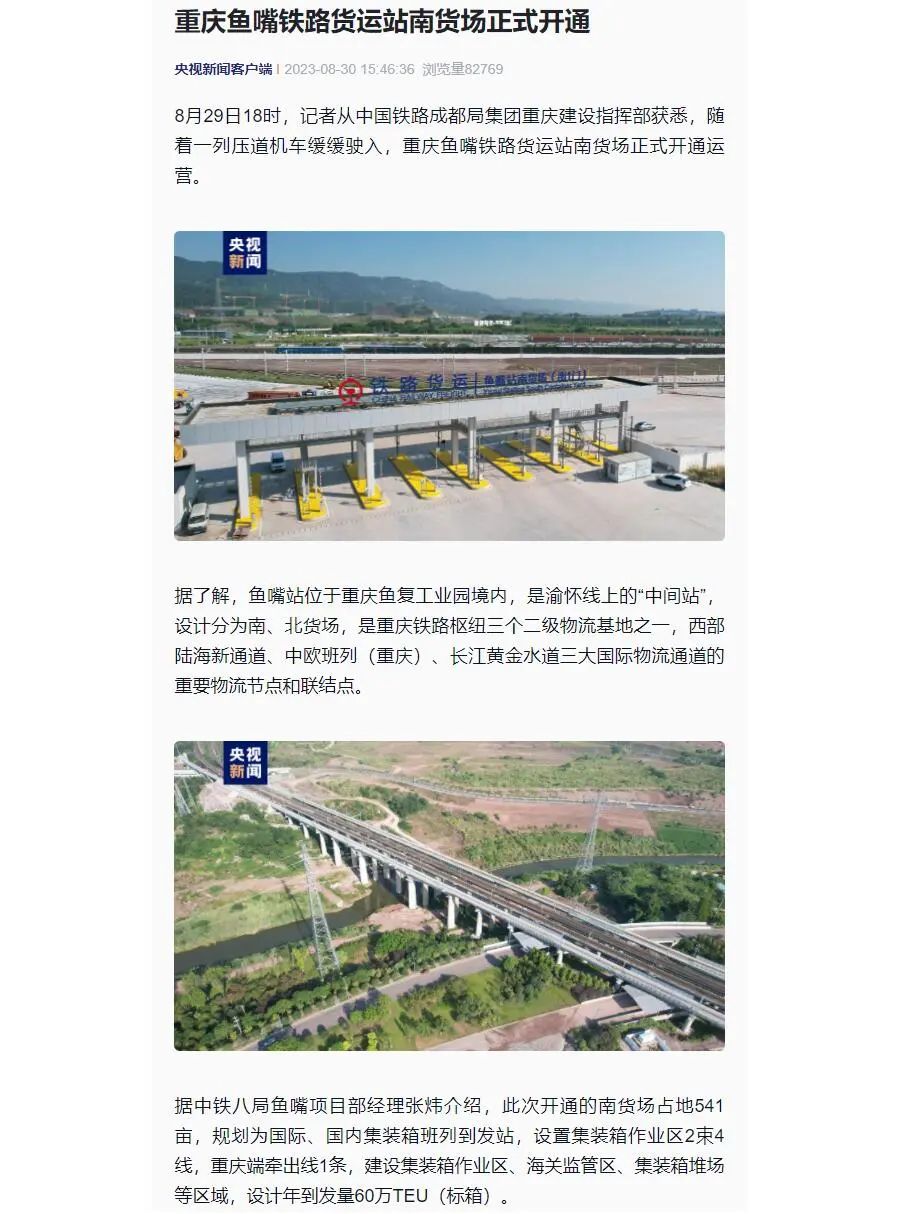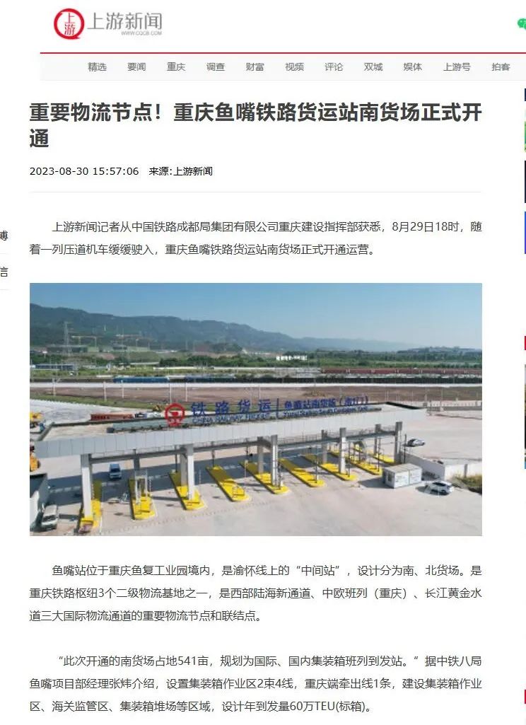 据了解,鱼嘴站位于重庆鱼复工业园境内,是渝怀线上的“中间站”,设计分为南、北货场。是重庆铁路枢纽3个二级物流基地之一,是西部陆海新通道、中欧班列(重庆)、长江黄金水道三大国际物流通道的重要物流节点和联结点。此次开通的南货场占地541亩,规划为国际、国内集装箱班列到发站,设置集装箱作业区2束4线,重庆端牵出线1条,建设集装箱作业区、海关监管区、集装箱堆场等区域,设计年到发量60万TEU(标箱)。