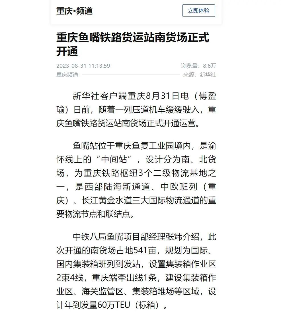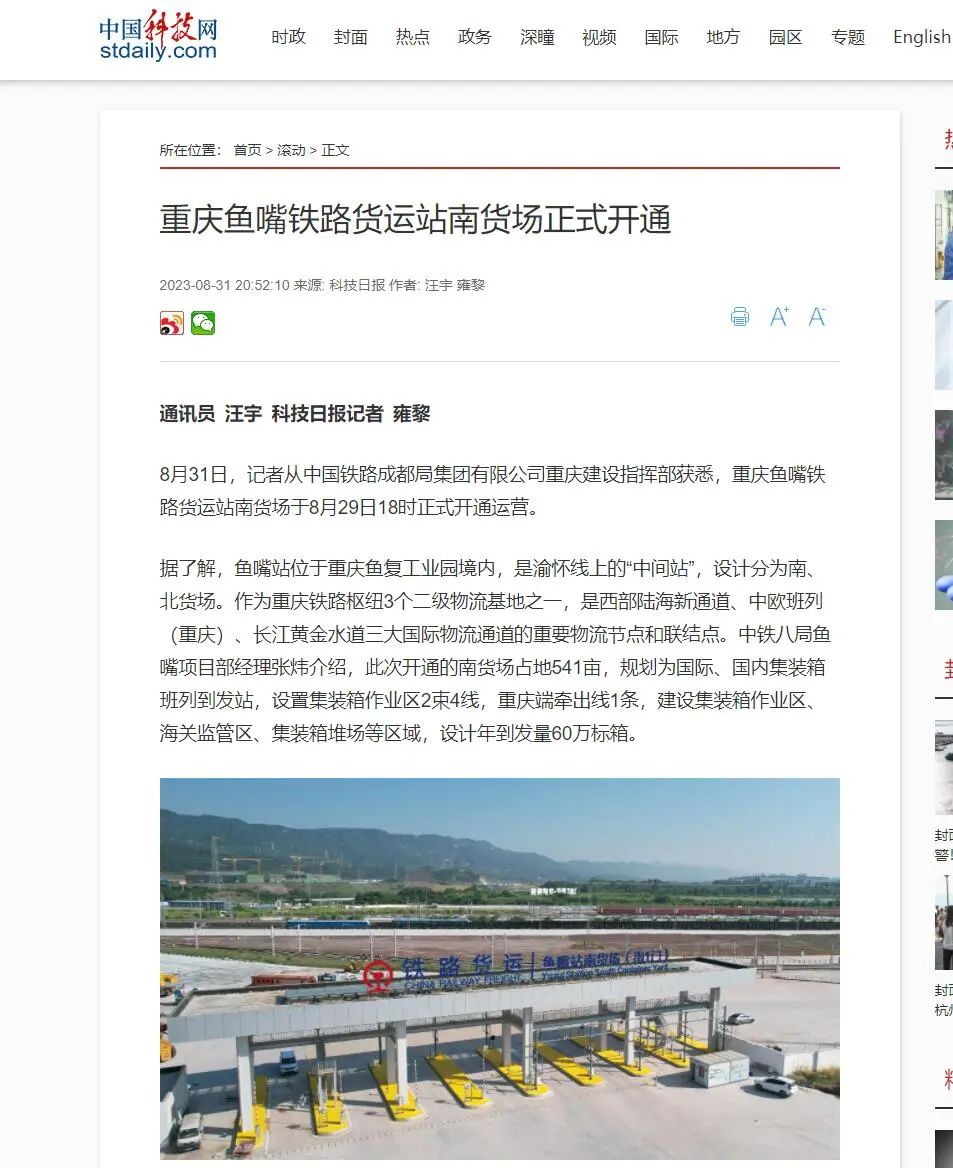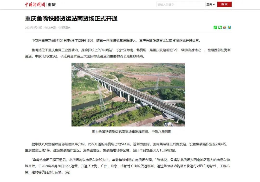 据了解,鱼嘴站位于重庆鱼复工业园境内,是渝怀线上的“中间站”,设计分为南、北货场。是重庆铁路枢纽3个二级物流基地之一,是西部陆海新通道、中欧班列(重庆)、长江黄金水道三大国际物流通道的重要物流节点和联结点。此次开通的南货场占地541亩,规划为国际、国内集装箱班列到发站,设置集装箱作业区2束4线,重庆端牵出线1条,建设集装箱作业区、海关监管区、集装箱堆场等区域,设计年到发量60万TEU(标箱)。