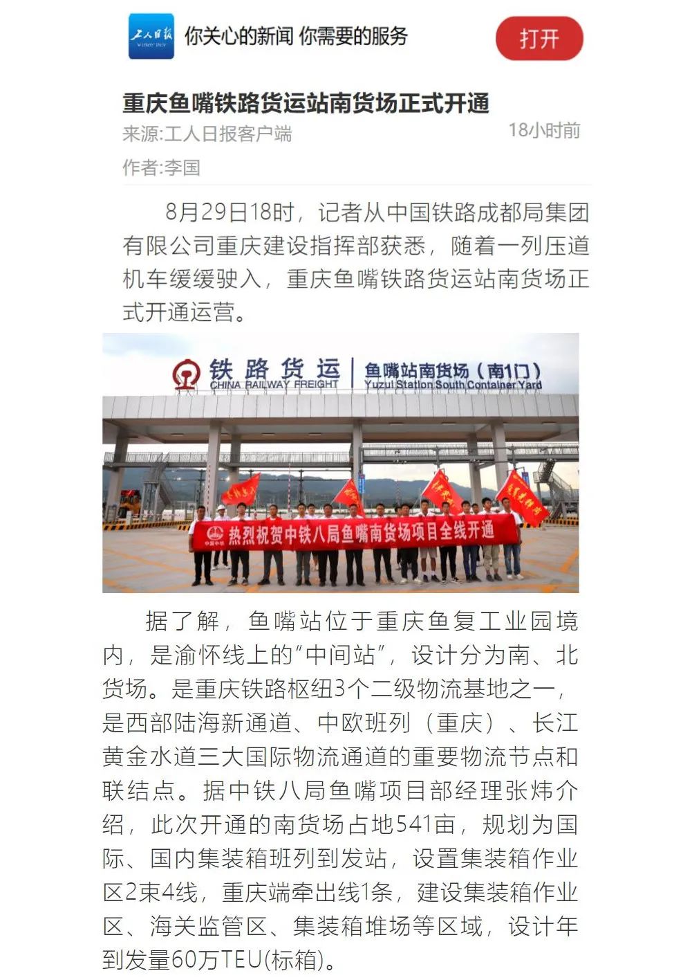 8月29日18时,随着一列压道机车缓缓驶入,由中铁八局承建的渝怀铁路鱼嘴站南货场正式开通运营。