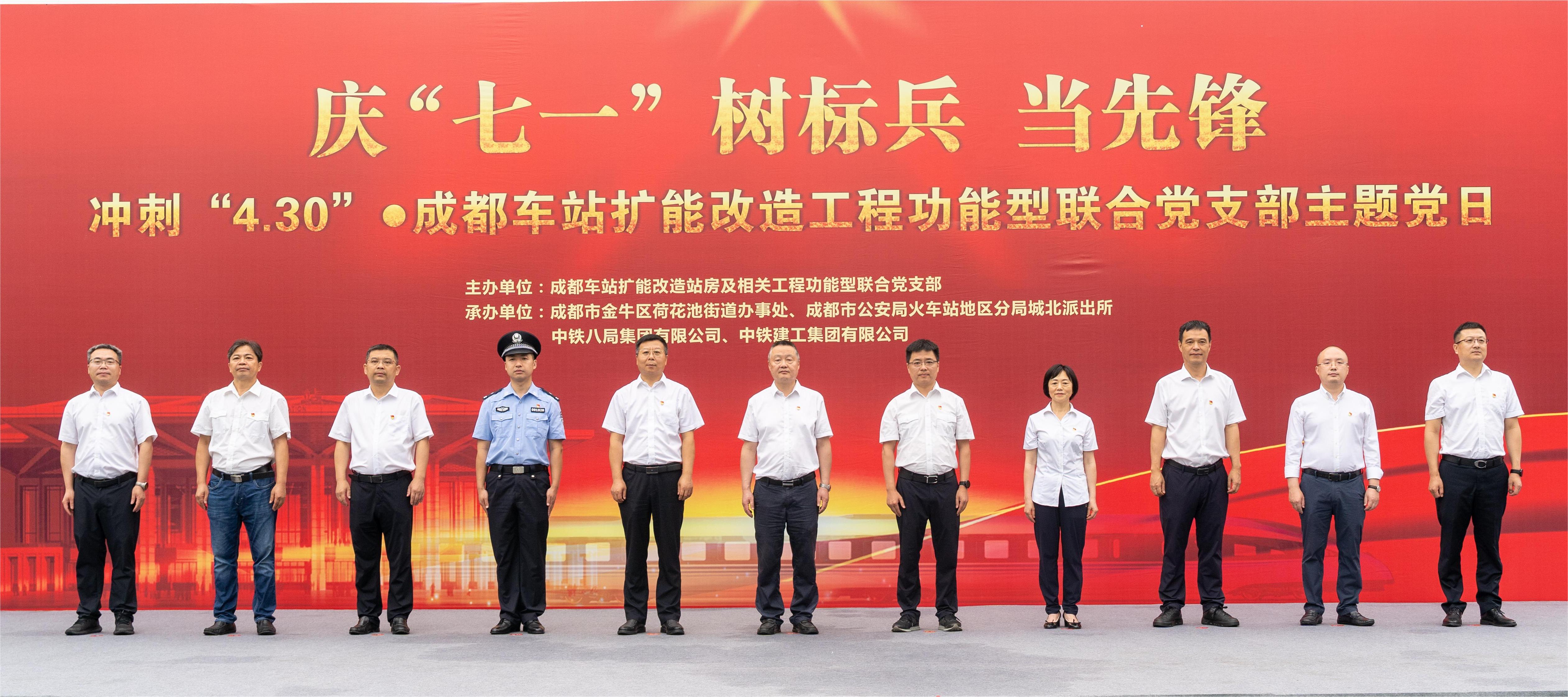 成都局客站指党委书记谢运来、副指挥长聂兆希,集团公司党委常委、纪委书记李家标,公司党委书记、执行董事许涛,荷花池街道党工委委员、组织委员赵玉,城北派出所副所长何洪,成都车站扩能改造站房及相关工程功能型联合党支部保障组、成都大西南监理公司、中铁二院、成都车站站房项目部和建工集团成都车站项目部相关人员等共计百余人参加活动。