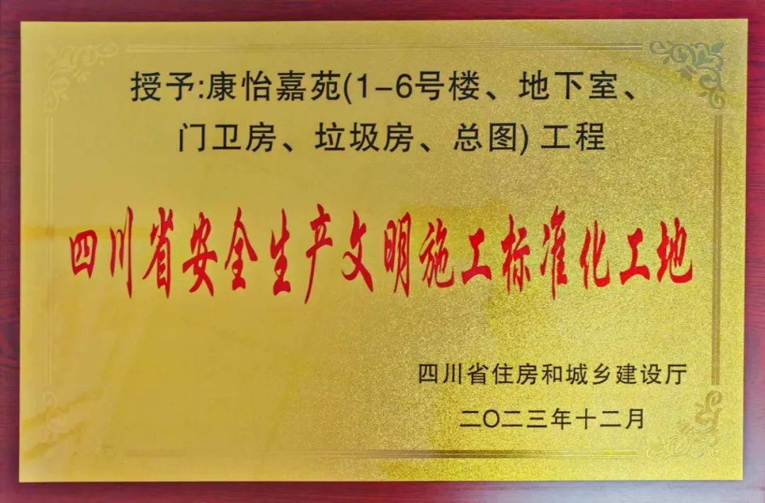 12月29日,经四川省安全生产文明施工标准化工地评审委员会审核、审议,由中铁八局承建康怡嘉苑项目荣获四川省安全生产文明施工标准化工地。