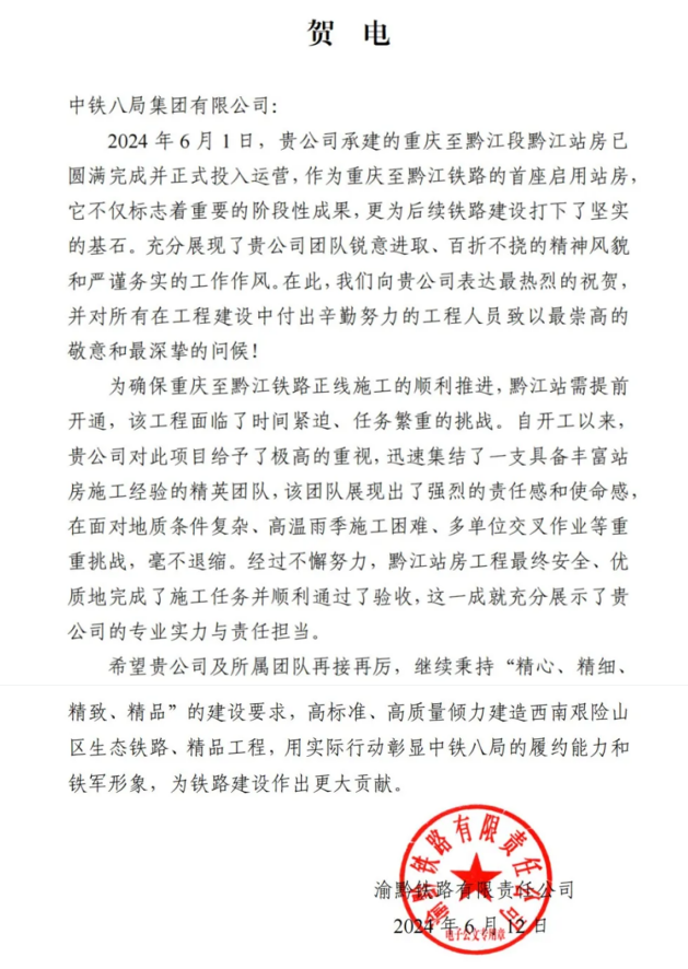 6月12日,渝黔铁路有限责任公司发来贺电,对公司重黔铁路站房3标项目部提前完成重庆至黔江段首个站房--黔江站房的建设任务,并于2024年6月1日正式投入运营致以最热烈的祝贺,同时,对所有在工程建设中付出辛勤努力的公司员工致以最崇高的敬意和最深挚的问候!