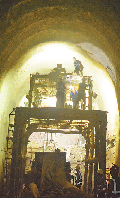 头顶围岩的滴水偶尔落在皮肤上,黏黏的,有一种温热感。“最热的地方在掘进掌子面,温度42摄氏度以上。”项目部总工程师秦鹏索性脱掉上衣,光着膀子套上了反光背心。