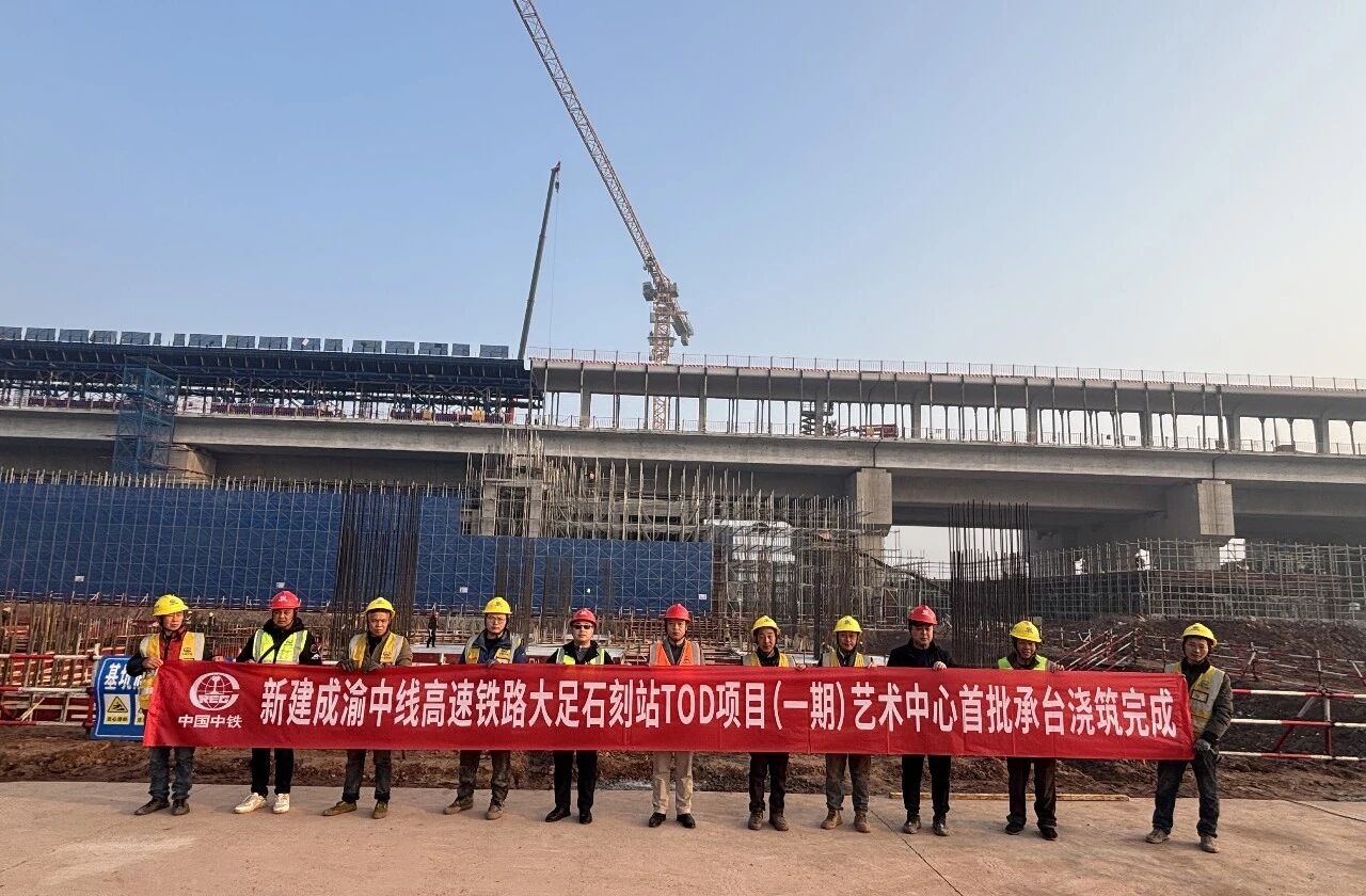 1月12日凌晨5点,新建成渝中线高速铁路大足石刻站(一期)艺术中心站房工程首批承台混凝土浇筑圆满完成。